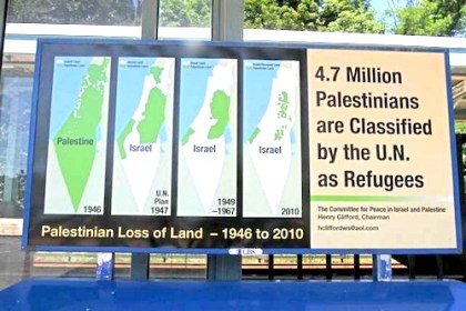 For the past few weeks, those taking local trains from New York City’s wealthier suburbs into Manhattan have encountered a succinct billboard history of the Israeli-Palestinian conflict. The lesson comes in the form of four aligned maps showing the absorption of Palestinian land by Israel from 1946 to the present, along with a declaration that “4.7 million Palestinians are classified by the UN as refugees”. In all respects, the advertisement is historically correct.