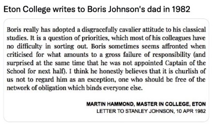 Johnson received the best education money can buy – Eton and all that. So, his apparent inability to tell right from wrong, without having someone on hand to advise him, comes as a surprise. The note below, allegedly from his housemaster to Mr Johnson senior, perhaps explains why.