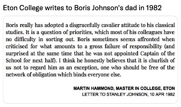 Johnson received the best education money can buy – Eton and all that. So, his apparent inability to tell right from wrong, without having someone on hand to advise him, comes as a surprise. The note below, allegedly from his housemaster to Mr Johnson senior, perhaps explains why.