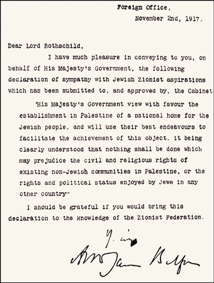 Right from the outset, rich Jewish bankers such as Lord Rothschild backed Zionism. It is unlikely we would have Israel now were it not for his influence. It was to this person that our UK Foreign Secretary Arthur Balfour promised Palestine in 1917 (Note that Jews are quick to declare their innocence on the matter of their influence – see “The myth of Jewish power”):